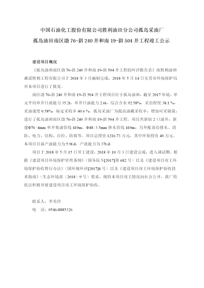 中國(guó)石油化工股份有限公司勝利油田分公司孤島采油廠孤島油田南區(qū)渤76-斜240井和南19-斜504井工程竣工公示