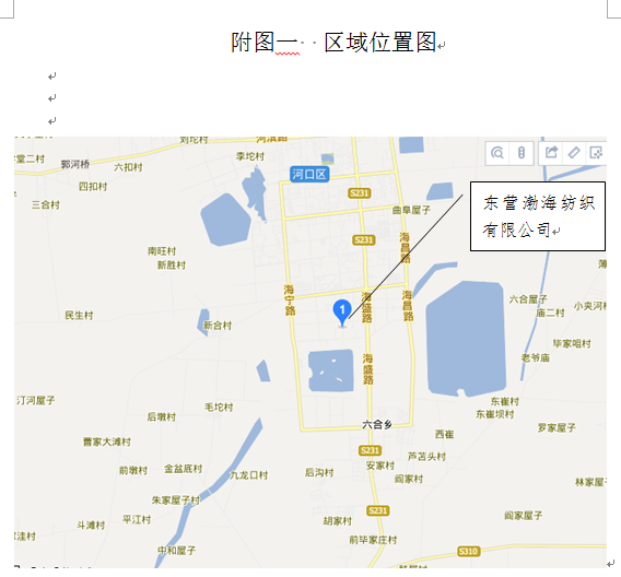 東營渤海紡織有限公司位于東營市河口區(qū)海河路以西、陽河路以北,占地面積100畝。廠區(qū)所在地南面為陽河路,距離為20m,廠區(qū)西面為東營市布萊特石油裝備有限公司、東營市三鎮(zhèn)服飾有限公司,距離大約15m;東面為海河路,距離大約為20m,海河路以東為金色河口(集團)新型材料有限責任公司、預制砂漿廠、東營建友新型材料有限公司、匯昶飼料廠和東營市廣和化工有限公司),距離為80m;北面為金河路,距離大約為20m,金河路以北為東營市大中南實業(yè)有限公司,距離大約為120m。 |