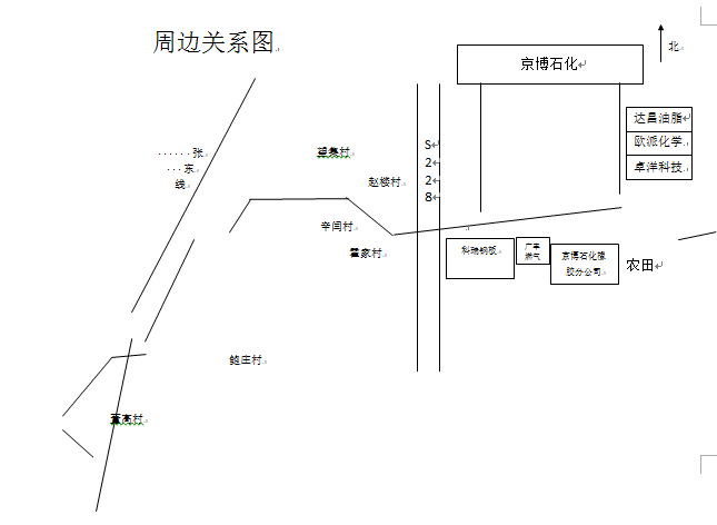 廠區(qū)西側(cè)為博小鐵路線,西側(cè)為盛和熱電有限公司和阿克蘇諾貝爾(博興)有限公司,再向西為勝利三路,自廠區(qū)西側(cè)出入口設(shè)一條道路與經(jīng)濟開發(fā)區(qū)化工路相通,化工路向南通向205國道,兩路交叉口西南方向為博興縣汽車站和協(xié)和醫(yī)院;廠區(qū)北側(cè)自西向東為凱和化工有限公司、董初村、董孫村,東側(cè)為空地,向東為淄東鐵路線,空地東北方向為董孫村部分民居、再向東為博興五中,空地東南方向為西上疃村;廠區(qū)向南依次為淄東鐵路線、引黃濟青干渠、205國道、東谷王村。 |