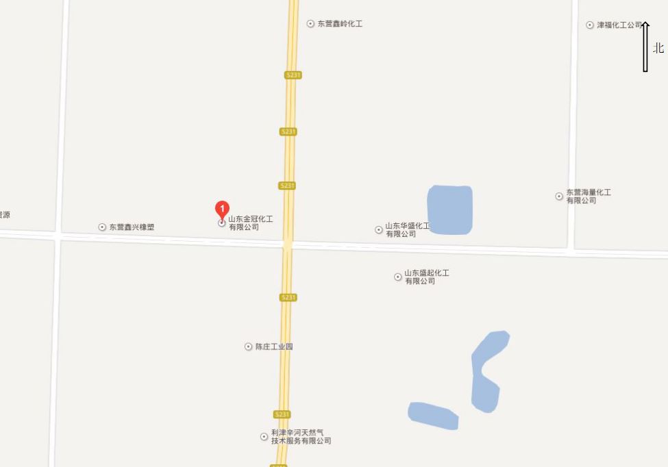 山東金冠化工有限公司位于東營市利津縣陳莊工業(yè)園。路東為S231,S231東側(cè)為華盛化工有限公司;廠區(qū)南側(cè)為北一路;西側(cè)為鑫興橡膠有限公司;東北側(cè)120米處,布置有機(jī)械采油井;北側(cè)為空地,空地以北為黃河口酒業(yè)有限公司。 |