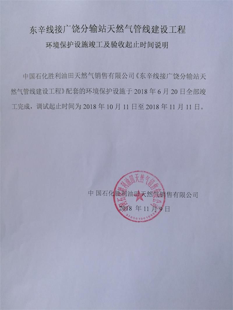 東辛線接廣饒分輸站天然氣管線建設(shè)工程環(huán)境保護(hù)設(shè)施竣工及驗(yàn)收起止時(shí)間說明