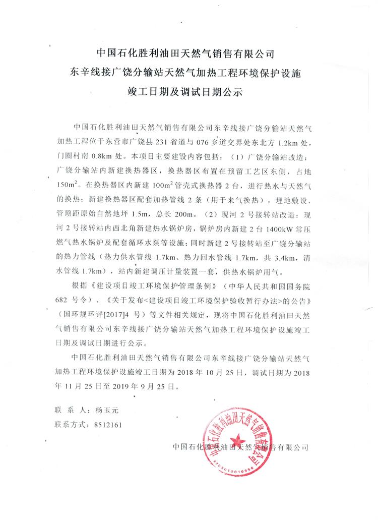 中國石化勝利油田天然氣銷售有限公司東辛線接廣饒分輸站天然氣加熱工程環(huán)境保護設施竣工日期及調(diào)試日期公示