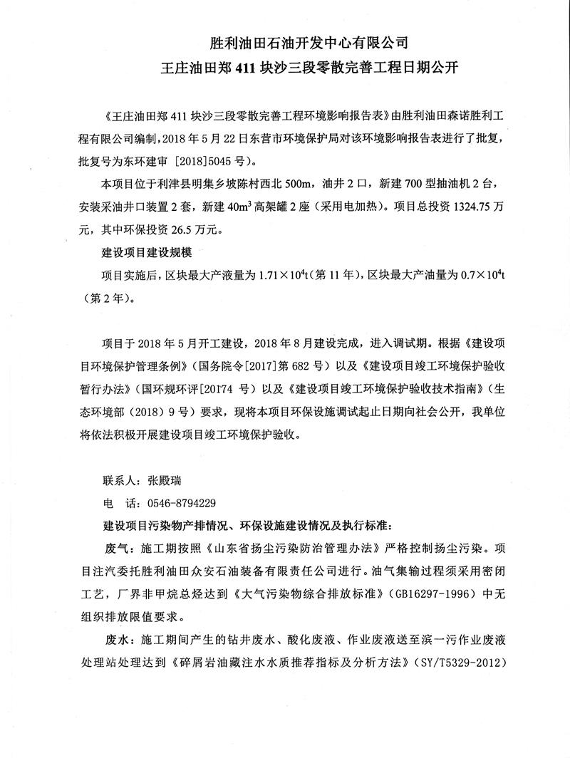 勝利油田石油開發(fā)中心有限公司王莊油田411塊沙三段零散完善工程日期公開