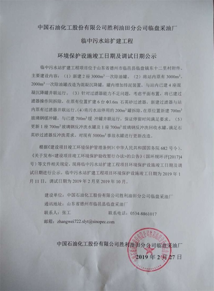 中國(guó)石油化工股份有限公司勝利油田分公司臨盤(pán)采油廠臨中污水站擴(kuò)建工程環(huán)境保護(hù)設(shè)施竣工日期及調(diào)試日期公示